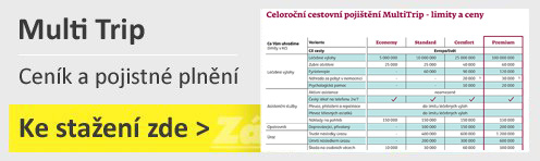 Pokud často cestujete během roku, nabízíme Vám pojištění MultiTrip. Počet cest není omezen a maximální délka jedné cesty do zahraničí je až 60 dnů. Výhodně lze pojistit i dítě se slevou 75 %, student se slevou 50 % a 50 % druhý partner na pojistce. Pojištění MultiTrip si můžete sjednat ve variantě Economy, Standard, Comfort nebo Premium. Pro každou variantu je na výběr ze sedmi typů připojištění dle Vašich potřeb.